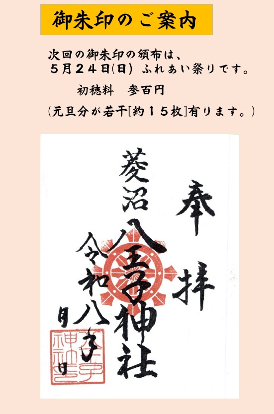 菱沼八王子神社では2026年5月24日(日)ふれあい祭りで御朱印を頒布します。